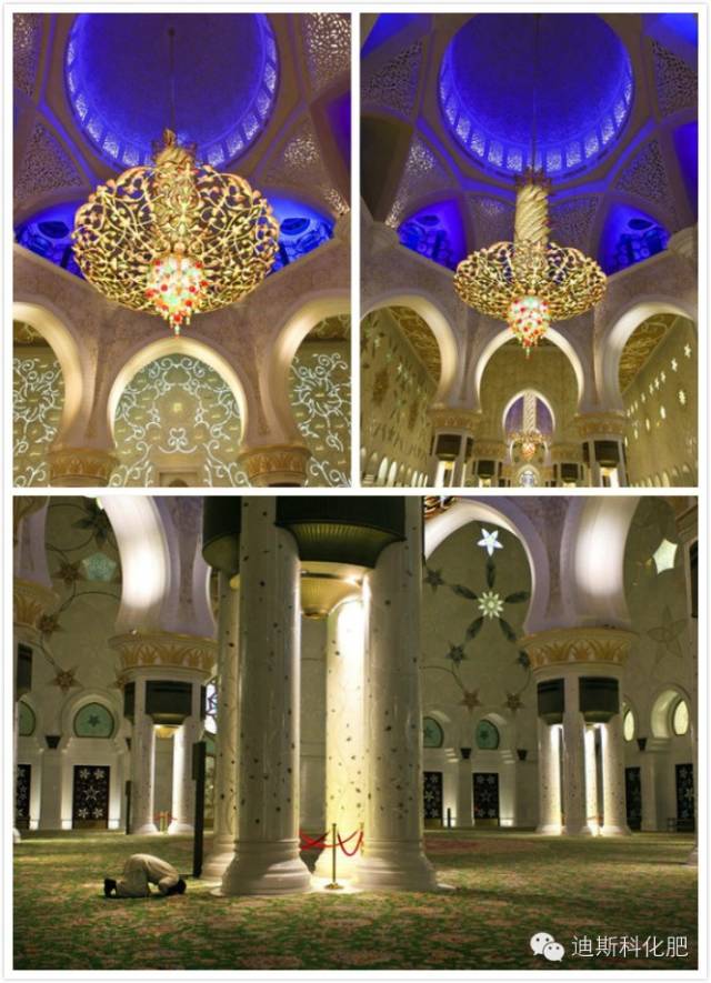 内部装饰:宝石贝壳镶嵌,每盏80万美金的施华洛世奇水晶吊灯。有全世界最大的一块人工地毯。筑群都用来自希腊的汉白玉包裹着,白色典雅,庄严肃穆。
