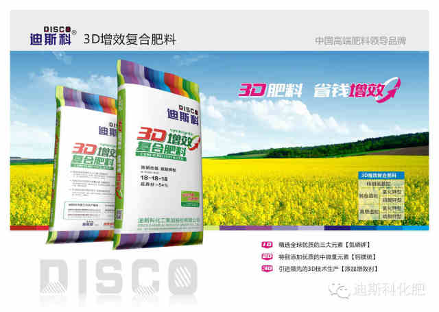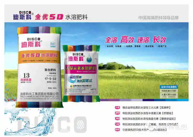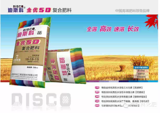 迪斯科化工集团股份有限公司,致力于成为世界领先的植物营养专家和作物全程解决方案服务商。专业从事高端肥料和新型肥料的研发、生产、销售及国际贸易。主要产品涵盖全优5D复合肥料、全优5D水溶肥料、3D增效复合肥料,以及后续即将推出的多肽复合肥料、双酶复合肥料、聚谷氨酸复合肥料、腐殖酸复合肥料、缓/控释复合肥料等八大系列新型肥料,迪斯科将成为中国高端肥料领导品牌。