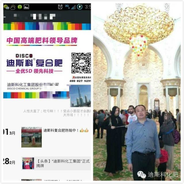 (左图为王总的微信页面,右图为王总参加2014年迪斯科核心经销商迪拜游时留影)